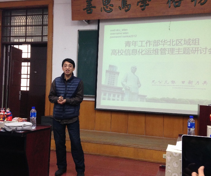 2013年12月14日,由学会青年工作部华北区域工作组和企业合作部联合主办、南开大学信息办承办,京津区域“高校信息化运维管理主题研讨会”在天津召开。来自北京大学、南开大学等18所京津两地高校的30余名青年技术骨干以及神州数码网络(北京)有限公司和北京星网锐捷网络技术有限公司的多名工程师参加了研讨。